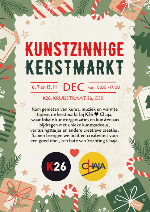 K26 opent in december haar deuren voor een bijzondere kerstmarkt, geheel in het teken van Stichting Chaja, de Osse organisatie die mensen ondersteunt die te maken hebben met kanker. De Kunstzinnige Kerstmarkt vindt plaats op 6, 7 en 13, 14 december 2025 tijdens de expositie ‘Een wandeling’.